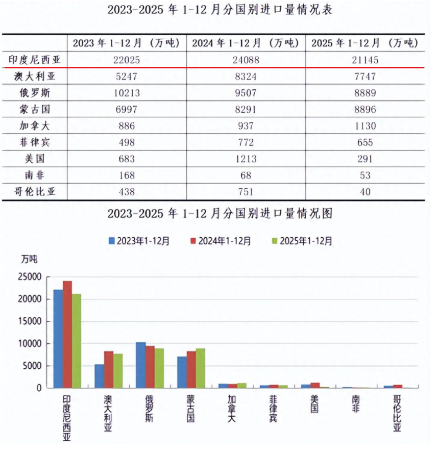 2026年初,印尼能源与矿产资源部为扭转煤价颓势,对主要矿商下达了远低于预期的年度生产配额,部分企业获批额度较申报计划骤降53%,减产幅度高达40%至70%。此举直接导致印尼矿商集体暂停现货煤炭出口。印尼政府明确计划,将2026年全国煤炭产量目标大幅削减至约6亿吨,较2025年的7.9亿吨减少近24%。
