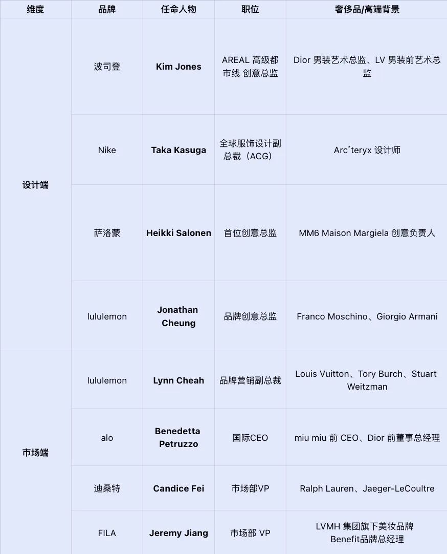 今年1月,alo任命Alo任命Dior前高管执掌国际业务;lululemon则在两年内连续更换品牌创意和营销总监,新人选均有LV、Armani等奢侈品从业经验;而国内市场的迪桑特、FILA,也早在2023年就已陆续吸纳具有奢侈品背景的人才,担任品牌市场部VP。