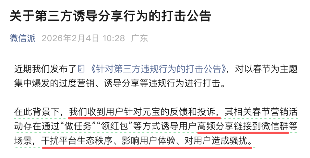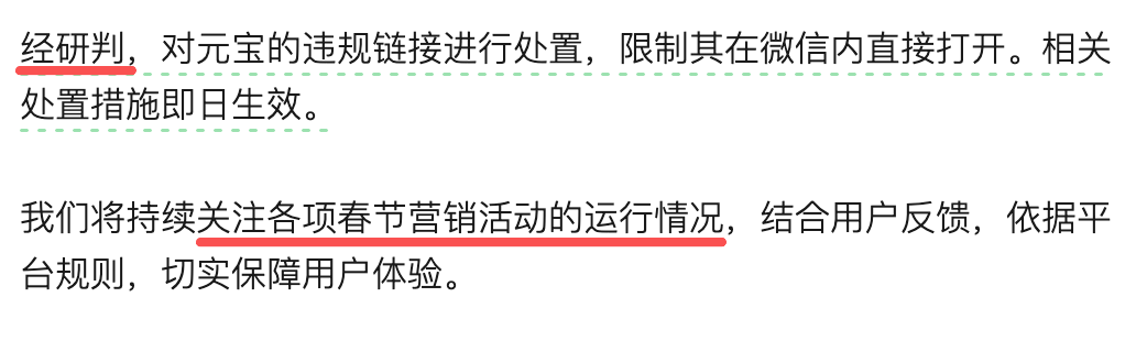 我们做一个这样的假设,如果元宝活动一开始在规则设定上只允许每个用户每天分享一次链接,那这个「影响」会不会大到让微信出手?