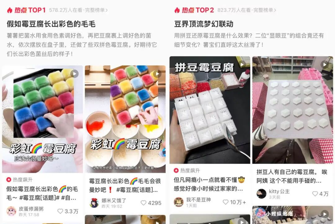 值得一提的是,除了美食和剧情类视频,霉豆腐的菌丝还蔓延至潮玩、时尚、摄影、人文等多个赛道,形成了涵盖万物的“霉豆腐宇宙”,还有多条话题登上小红书热榜。