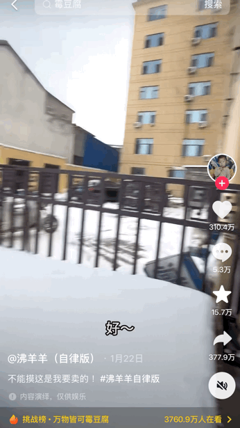 1月22日,“沸羊羊(自律版)”在抖音发布了一条模仿卖霉豆腐的视频,目前点赞数超306万,这是霉豆腐二创中获赞最多的一条视频。