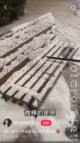 这天抖音创作者“悲伤小蛤蟆”发布了一条在公园长椅上用积雪做霉豆腐的视频,获赞超162万,转发超78万。不少网友在评论区留言,“还以为就我一个人爱看”“第一句话出来我就知道考点了”。