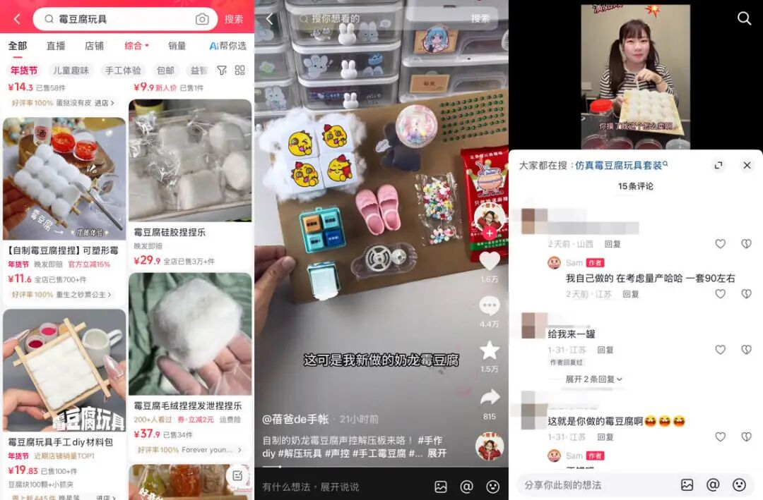 与此同时,与霉豆腐有关的潮玩类周边产品应声而起,如霉豆腐捏捏乐、霉豆腐奶龙、霉豆腐玩具材料包等玩具,均在近期全网上架。其中一款霉豆腐捏捏乐,已在抖音售出超100单。