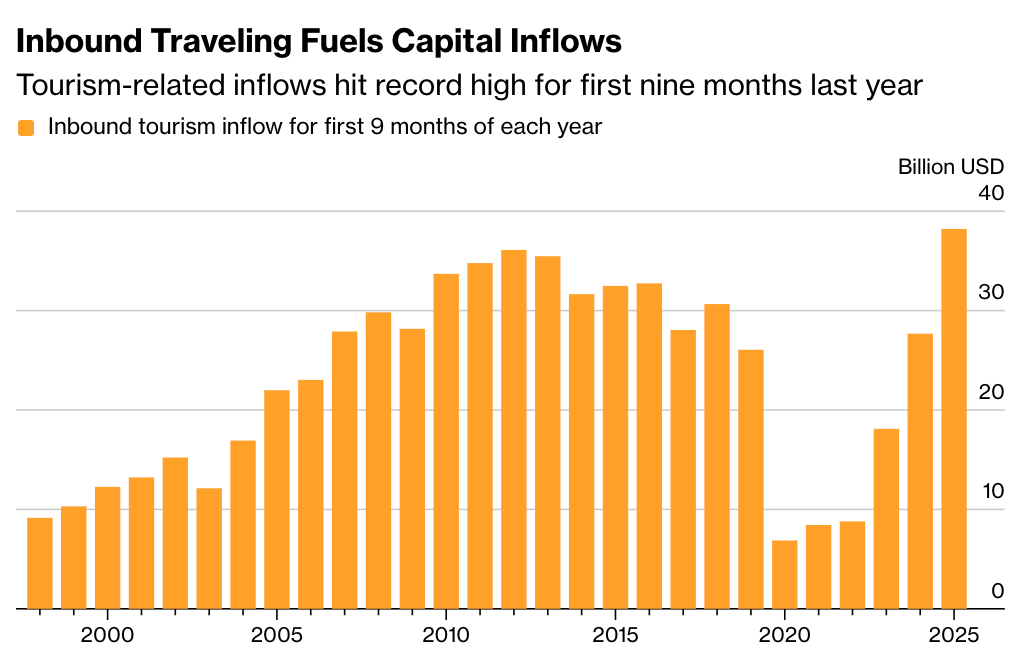官方数据显示,去年北京、江苏、广东等主要旅游目的地的入境游客数量均同比增长约40%,带动旅游相关资金流入实现两位数增长。在政策层面明确表态要进一步吸引海外游客的背景下,这一趋势可能继续推高人民币走势。目前,人民币已录得十多年来最长的一轮周线连涨。