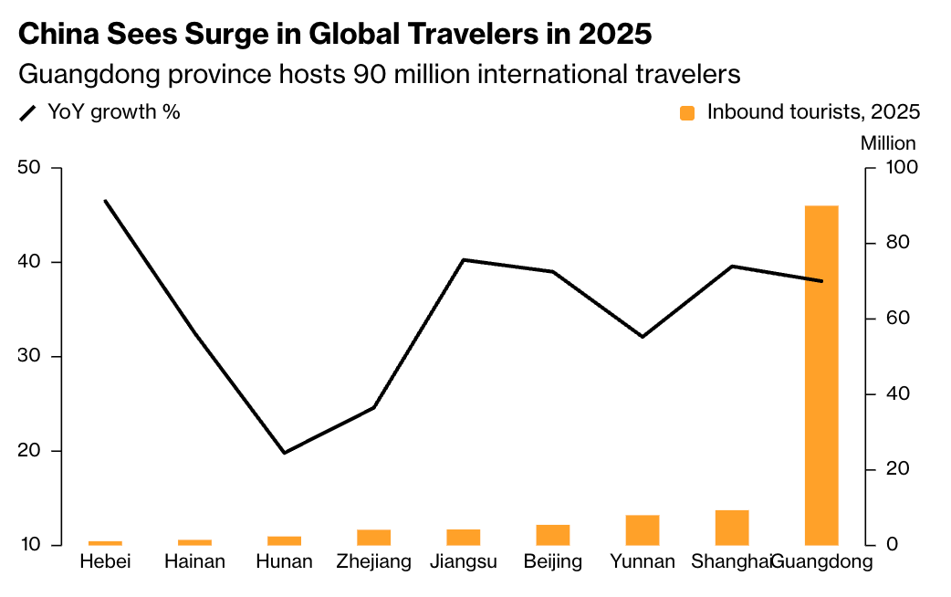 具体来看,2025年外国游客在北京的消费达到创纪录的506亿元人民币(约73亿美元),同比增长45%。广东省去年接待游客超过9000万人次,消费总额超过2000亿元人民币,同比大增54%。