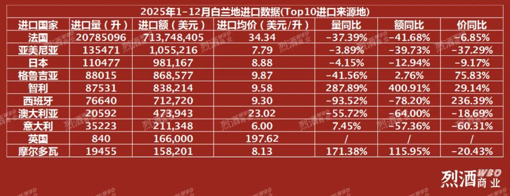 从成因来看,这一剧烈下滑并非单一因素所致。一方面,中国酒类消费整体仍处于低位修复阶段,高端消费意愿明显回落;另一方面,自中国商务部启动对欧盟白兰地反倾销调查以来,政策不确定性持续影响市场预期。尽管在部分时间节点,政策消息释放后市场曾出现短暂的环比回稳,但从全年维度观察,以法国干邑为核心的白兰地进口显著承压。