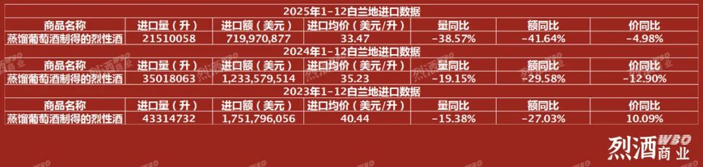数据显示,2025年白兰地的进口均价为33.47美元/升,同比下降4.98%;2024年进口均价为35.23美元/升,同比下降12.9%;而2023年进口均价为40.44美元/升,同比增长10.09%。从这一轨迹可以看出,进口均价在2023年短暂冲高后,随即进入连续下行通道。