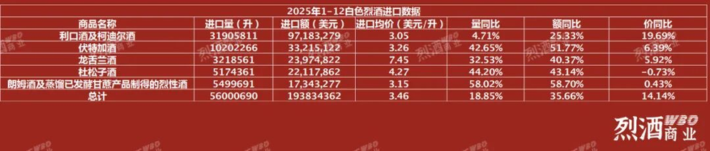 根据海关总署公布的2025年进口数据,白色烈酒的进口量总计为5600万升,进口额为1.93亿美元(约合人民币13.42亿元),同比增长18.85%、35.66%。