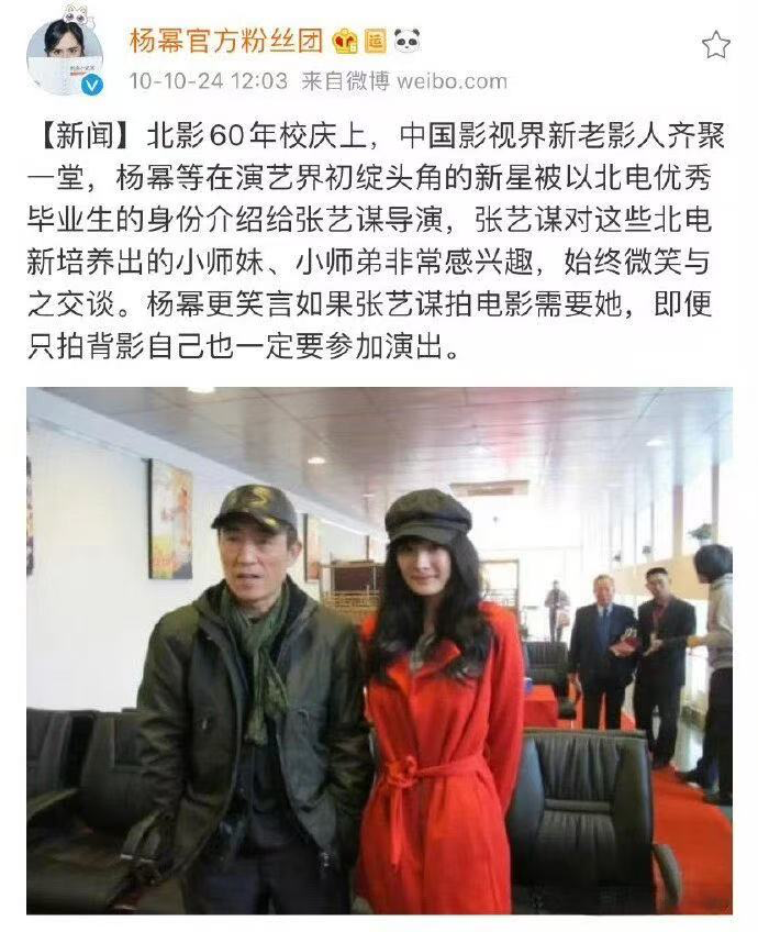 那是2010年北影60周年的校庆,初露头角的杨幂,以优秀毕业生的身份和张艺谋相见,表达了合作意愿。