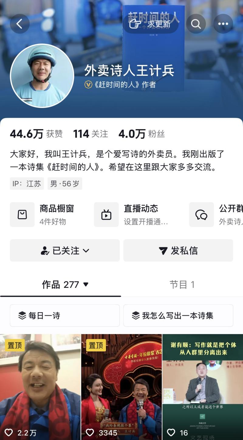 走红后,王计兵也注册了抖音,他的诗开始被越来越多的人看见。