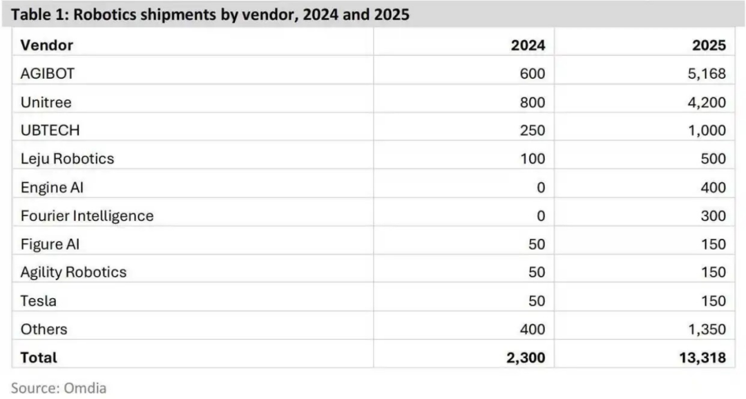 据Omdia报告,2025年全球人形机器人总出货量预计达1.33万台,相较上年的2300台大幅增长479%,前三名是智元机器人(5168台)、宇树科技(4200台)、优必选(1000台);另据Counterpoint报告,去年全球人形机器人装机量约为1.6万台,前三为智元机器人(4864台)、宇树(4224台)和优必选(832台)。