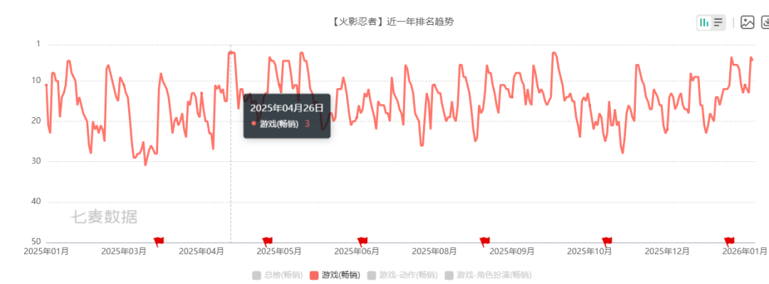 而火影忍者这个IP最厉害的,一直就是腾讯魔方工作室的台柱子——《火影忍者手游》,根据点点数据的报告,该产品在2025年总流水为14.68亿元。或许流水数据大家不敏感,仅说一点,公测10年到现在,我们还经常能在畅销榜头部【第三名】看见这款游戏。而且这款产品在公测第十年,最差的成绩是32名,说个参考——《原神》公测第8年了,它在2025年畅销榜最差成绩是70。