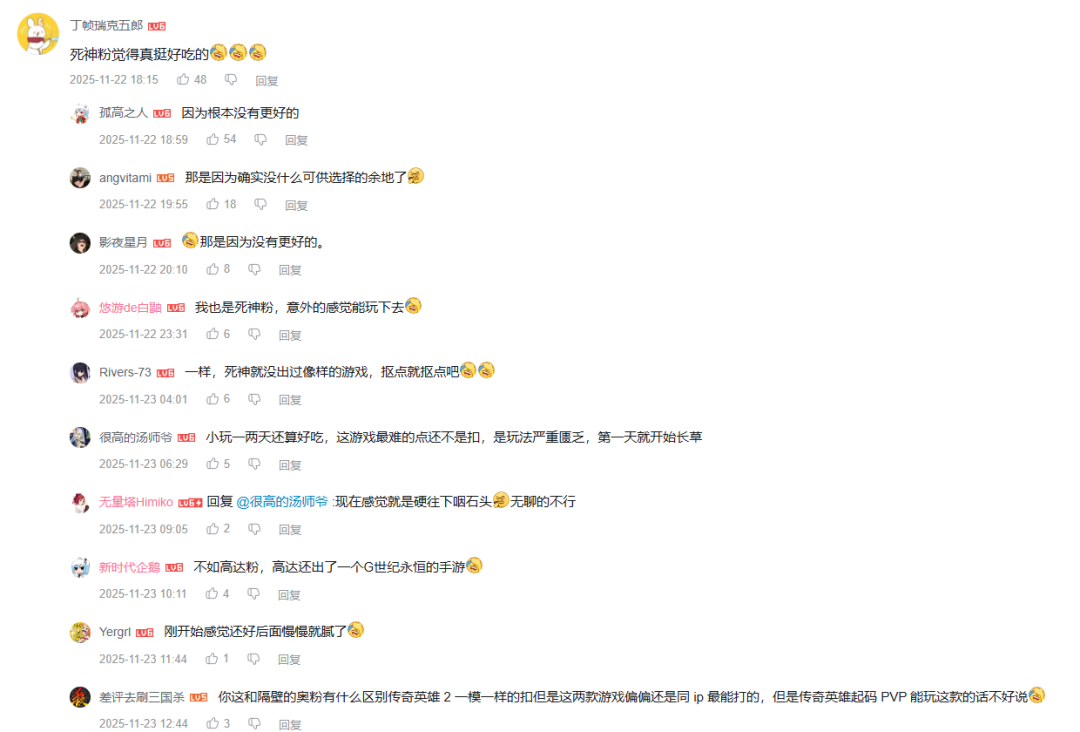 相信划到这里的读者,如果你是IP粉丝,应该会和以下的用户有一样的心声,死神IP粉以前吃的太差了!这个现象使得IP粉对于《境界刀鸣》一些品质不足的地方,也会溺爱。