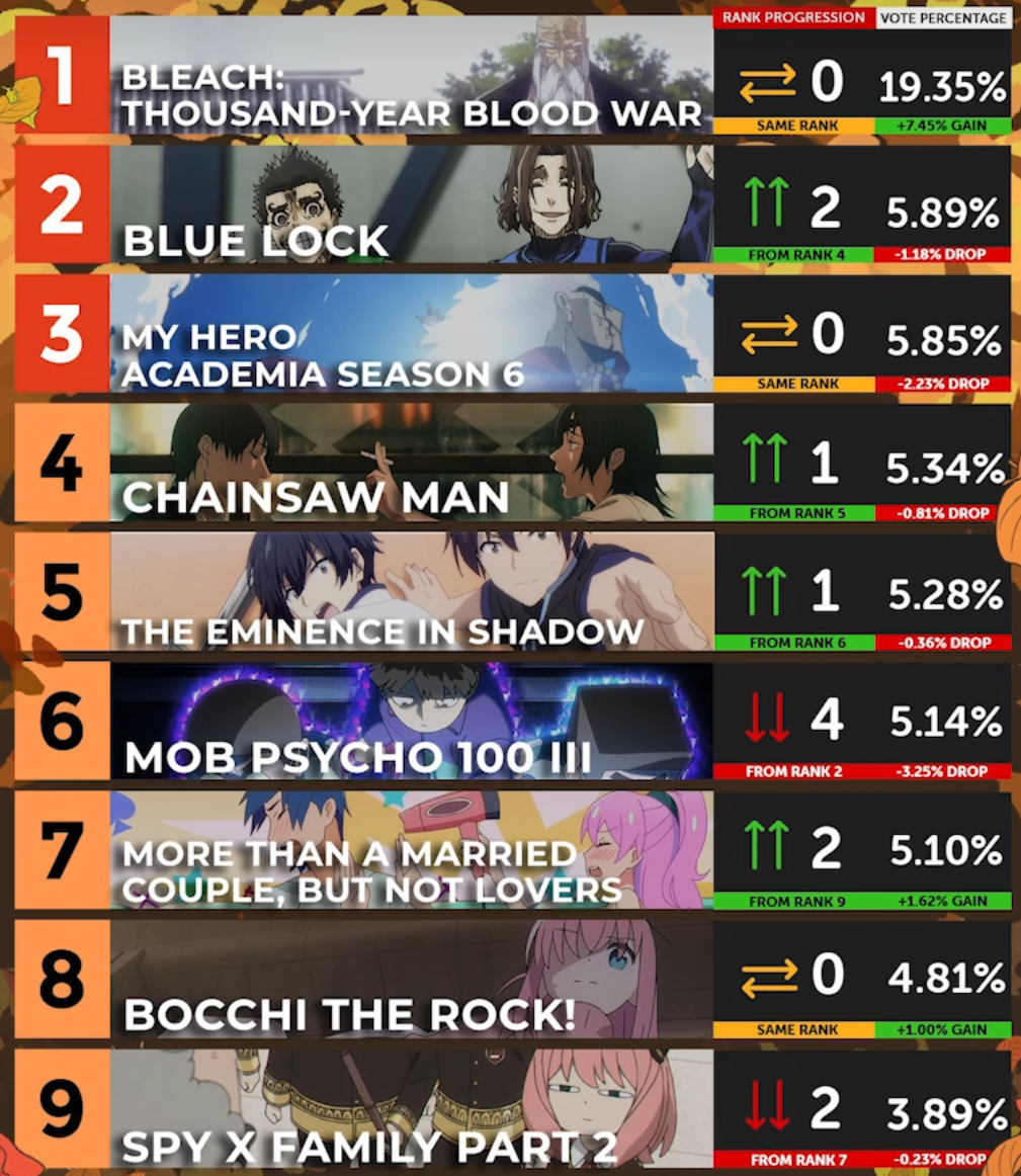 第三部分,也是第二重要的因素,就是死神这个IP的新作——《千年血战篇》的热映,让这个IP在这几年重新回到了大众视野,其开播时曾多次在外网获得较高的排名。(举个例子:在2022年Anime Corner第七周的番剧排行榜上,死神排名第一,当时正火的《蓝色监狱》还在其之下)