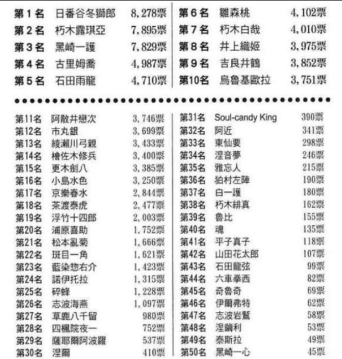 综上,在还原度这个基础上来看的话,这个产品其实非常有优势;且因为它不需要事先培养玩家对角色的喜爱度(这些喜爱度已经通过IP补充了),它有着很好的付费下限。其次,死神是群像刻画非常好的IP,通过死神在《少年jump》上连载时的第四回角色人气投票来看,足足有26位角色获得了1000以上的票数(总票池-9W票),这还不计算角色的各个状态,换句话说,《境界刀鸣》有非常多可以出的角色,这也侧面印证了该产品的商业化潜力。