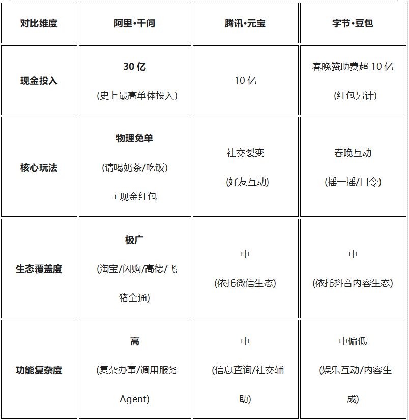 参战方代表分别有阿里千问,腾讯元宝与字节豆包,有人将三家的模型戏称为“千元豆”。总投入现金超过50亿人民币。这应该是中国商业史上的一次新高峰,目标则是抢夺通往下一代互联网的入场券。