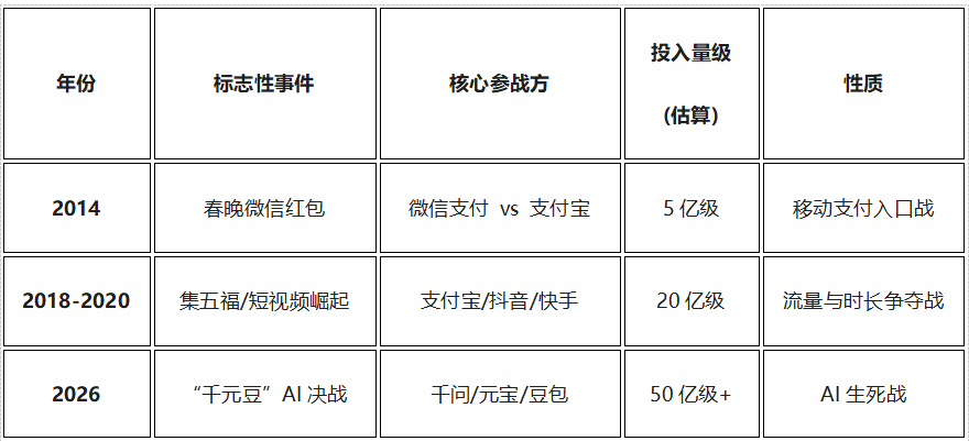 如果说12年前的微信红包偷袭珍珠港,开启了移动支付的黄金十年,那么2026年的这场AI红包大战,将决定未来十年AI时代入口归属。