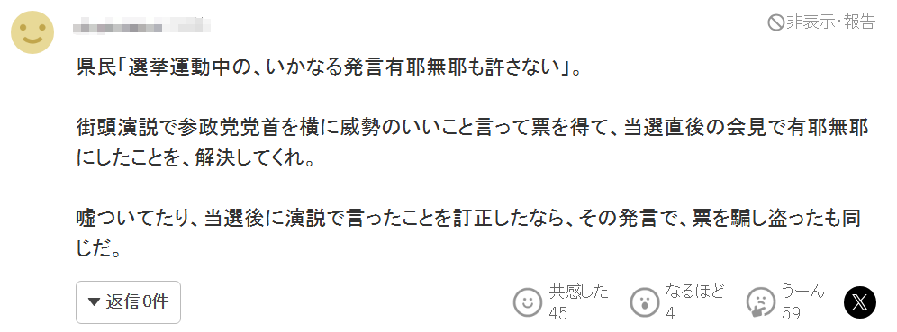 搜了一下才知道,他辞去了外务省的工作来参加福井县知事选举。我便想,虽说是偏乡下的福井县,“辞去稳定的工作,不是参加市议员和县议员的竞选,而是参加知事选举!这是在赌人生啊!我支持你。”