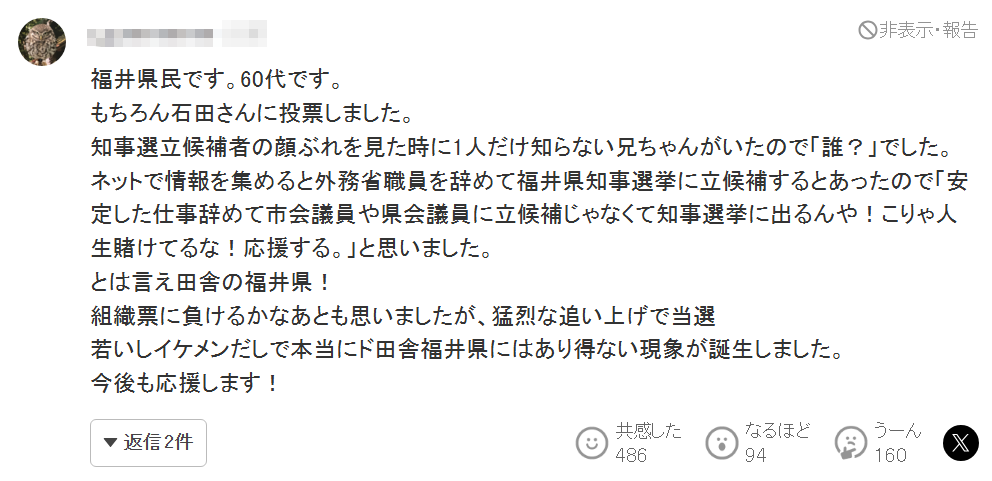我是一位60多岁的福井县民。我当然把票投给石田先生了。