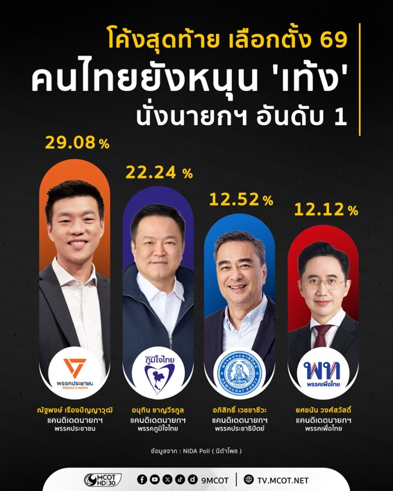 NIDA民调公布的“2026年大选趋势”民意调查结果,于2026年1月23日至27日期间进行,调查对象为2500名18岁及以上人士,涵盖泰国各地、不同教育水平、职业和收入阶层。图中从左至右依次为:人民党、自豪泰党、民主党、为泰党的候选人。