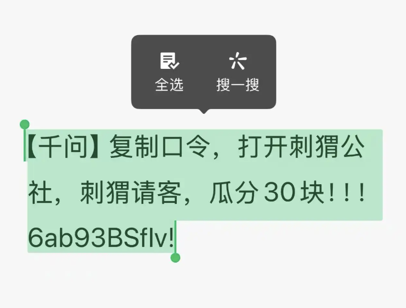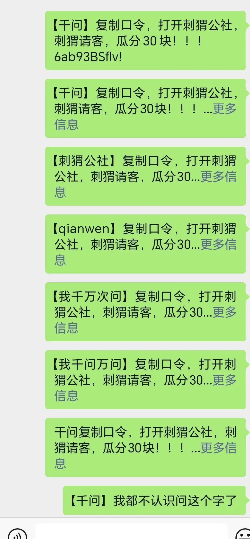由此,我们编辑好一条刺猬公社发放30块红包的分享口令,也蹭了一把被微信禁止复制的待遇。【千问】复制口令,打开刺猬公社,刺猬请客,瓜分30块!!!6ab93BSflv!
