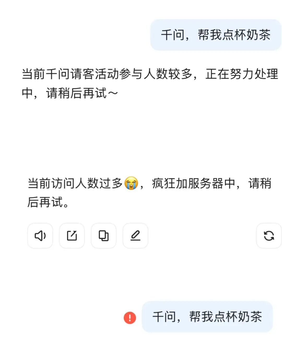 一上午,我手机里的千问统共闪退超过10次。AI先是卡顿,接着道歉,最后直接发来一个红色感叹号❗️看来即便是阿里的服务器也无法承载人们参与外卖大战的热情。