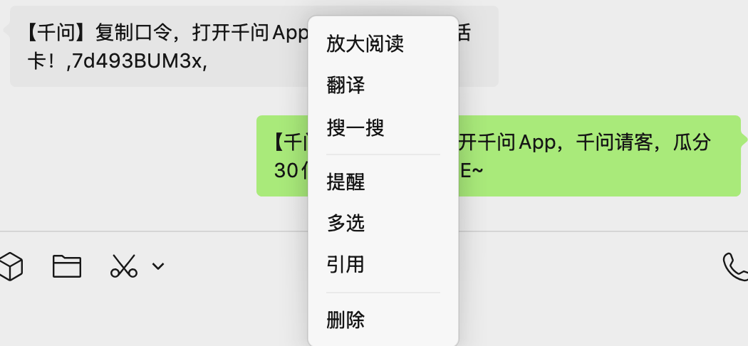 链接方法失效后,用户在微信持续分享的大多是文字口令,好友需要复制口令后自行打开千问APP,再跳转到活动界面。但在2月6日中午12时左右,千问活动的文字口令开始在微信聊天界面被禁止复制,复制选项直接从功能框里消失。