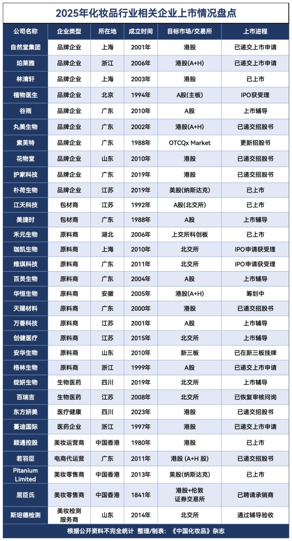 在这轮浪潮中,品牌方无疑是聚光灯下的主角。老牌国货与新兴势力齐头并进:林清轩已成功登陆港股,打响年内高端护肤品牌上市第一枪;自然堂、珀莱雅、丸美等巨头则密集递交港股(或“A+H”)招股书,谋求更大舞台;植物医生、谷雨等特色品牌也在A股赛道加速推进,试图在市场讲好各自的品牌故事。