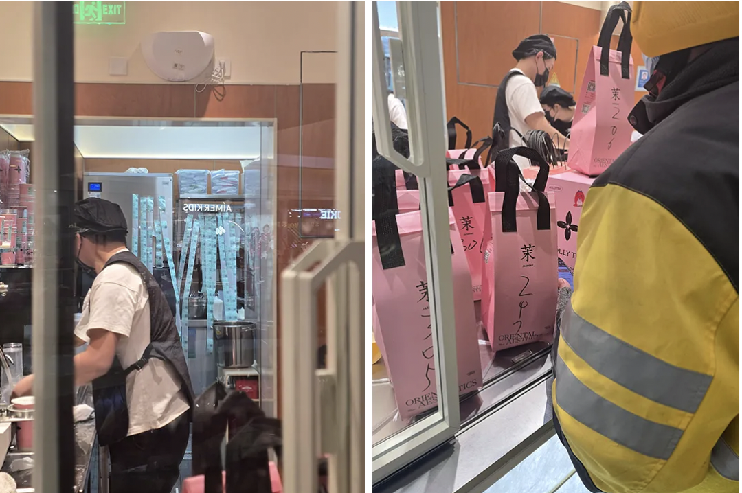 附近商场里的茉莉奶白,店里店员正来回穿梭,背后的小票像瀑布一样,做好的奶茶堆在一起,包装上用马克笔做了单号标记方便骑手取餐。