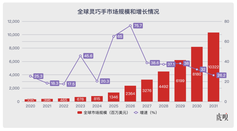 根据第三方统计机构QYResearch统计,全球机器人灵巧手市场进入持续扩容期。2024年全球灵巧手规模达到了8.15亿美元,预计2031年全球灵巧手规模将达到103.22亿美元,年复合增长率为40.4%。
