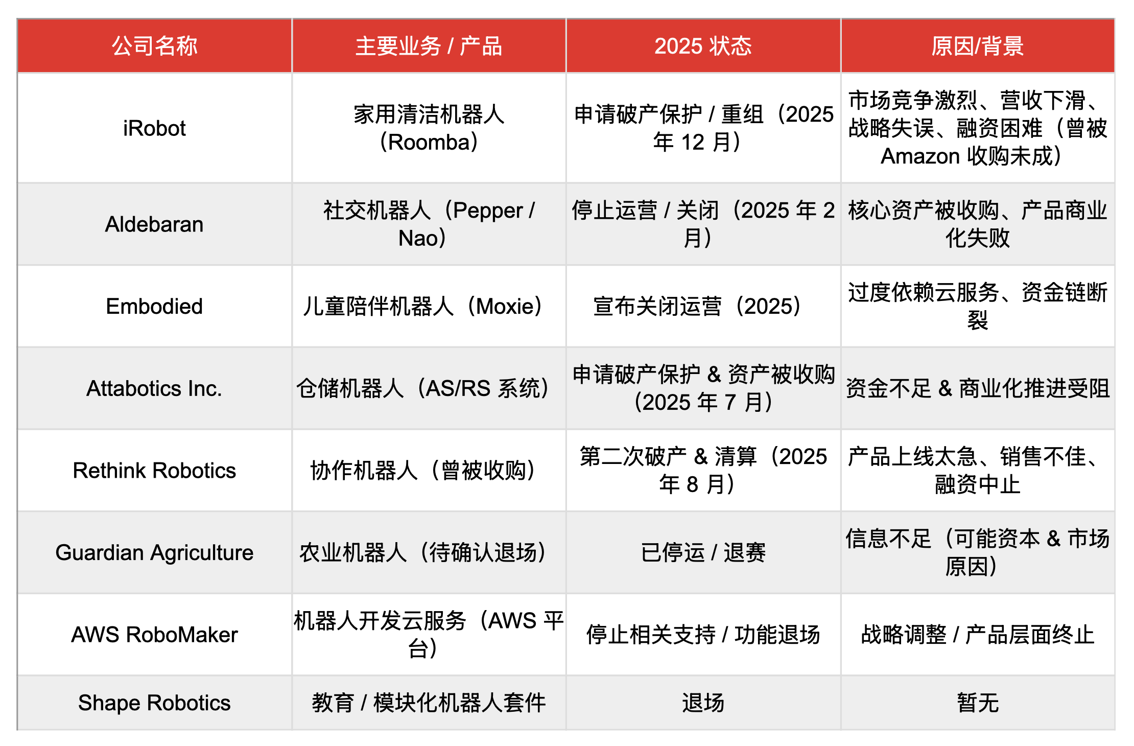 2025年全球部分破产的机器人公司(不完全统计)