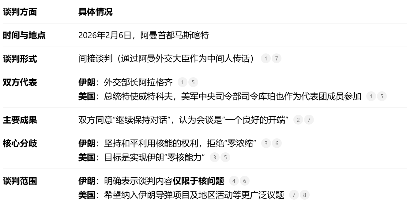 2026年2月6日,伊朗和美国在阿曼首都马斯喀特举行了自2025年6月谈判中断以来的首次核问题谈判。这次谈判成功地重启了中断已久的外交渠道,避免了局势立即升级,这是其最积极的成果。