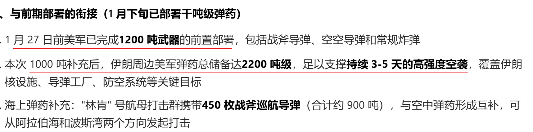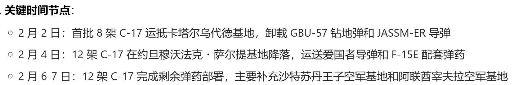 最近一周(2026.2.1-2.8)美军向伊朗周边完成1000 吨级精确制导弹药与防空装备的补充部署,主要通过C-17 重型运输机空运至卡塔尔、约旦、沙特等前沿基地,与 “林肯” 号航母打击群的450 枚战斧导弹形成 “空中 + 海上” 双重打击体系,为可能的多波次空袭提供弹药保障。