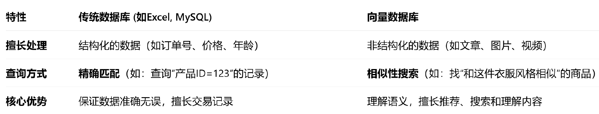 很多人会把向量数据库和传统数据库对比,其实二者不是 “替代关系”,而是互补关系—— 企业数字化中,传统数据库负责处理 “稳态业务”(比如交易、记账、数据统计),向量数据库负责处理 “敏态 AI 业务”(比如语义检索、AI 推荐、大模型落地),核心区别如下: