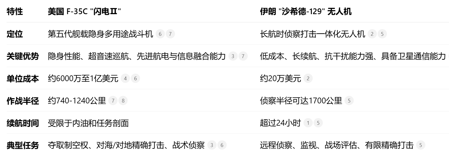 F-35C在隐身、速度、机动性和武器载荷上拥有压倒性优势。它能在伊朗现有的防空系统(如S-300)的有效探测距离之外活动,扮演“外科手术刀”的角色。使用价值数百万美元的防空导弹(如AIM-9X空空导弹,成本约45万美元)去拦截仅价值几十万美元的无人机,对美军来说在财政上是不可持续的。这正是非对称作战的精髓。动用最先进的战机应对廉价无人机,被外界评论为“高射炮打蚊子”,是一场“亏本的胜利。