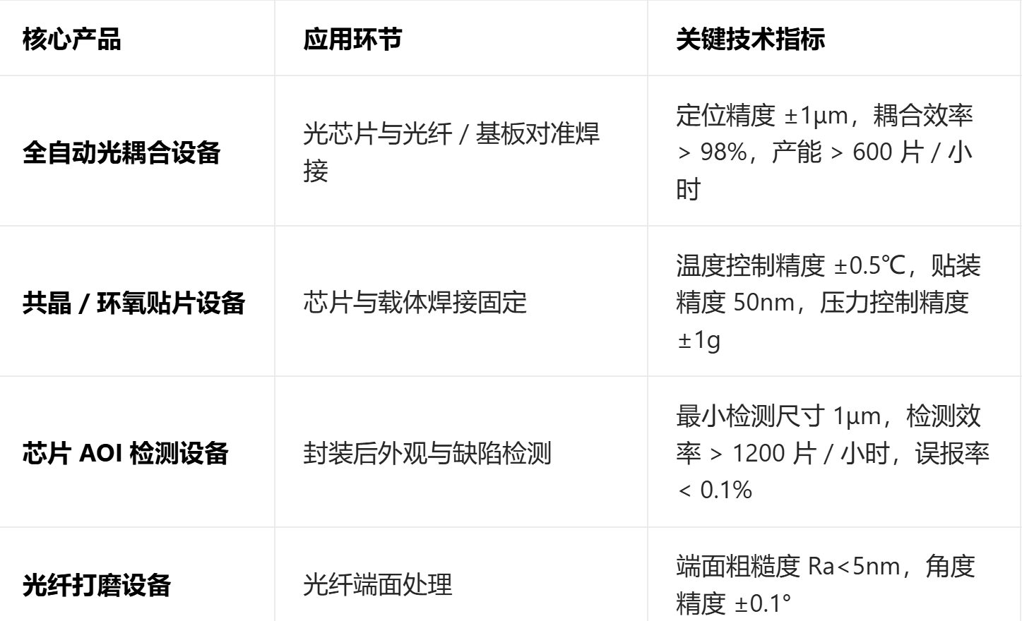 科瑞技术专注于光模块后端封装与测试环节,提供从芯片贴装、光耦合到外观检测的全流程自动化解决方案,是光模块量产过程中不可或缺的关键设备供应商。