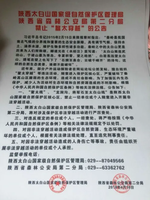 陕西省森林公安局第二分局禁止“鳌太穿越”的公告