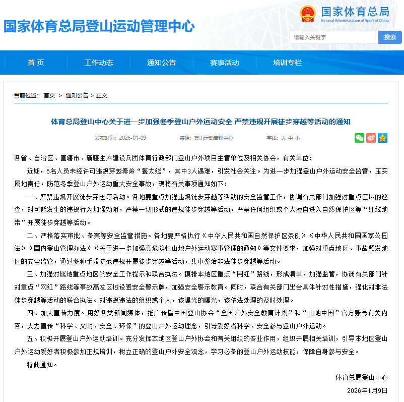 鳌太事件发生后,其影响迅速从舆论层面延伸至行业管理层面。针对户外运动中暴露出的安全风险与违规问题,国家体育总局登山运动管理中心于2026年1月9日发布了《关于进一步加强冬季登山户外运动安全严禁违规开展徒步穿越等活动的通知》。