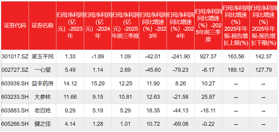 2025年业绩预告显示,漱玉平民利润扭亏,一心堂利润重回正增长;益丰药房前三季度均保持不低于10%的利润增速,以及大参林从一季度开始利润同比增速保持正值;老百姓前三季度利润增速虽是负值,但第三季度的利润是正增长,有向好改善的迹象。