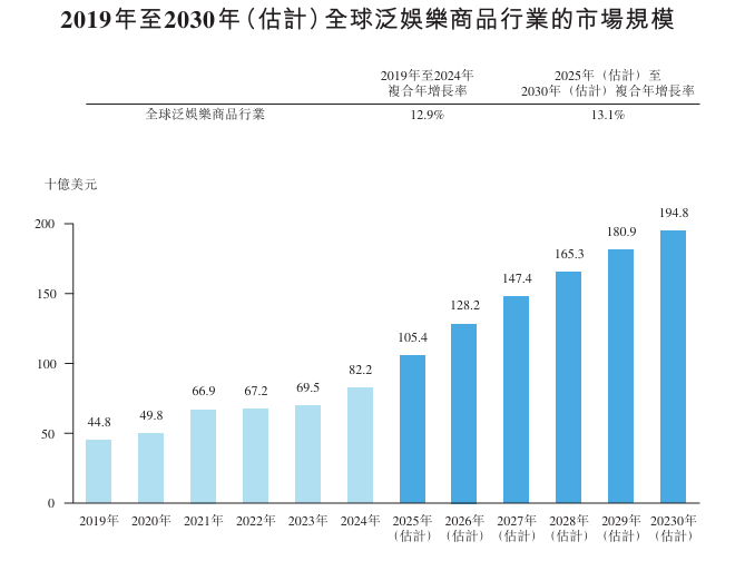 图丨2019年至2030年(估计)全球泛娱乐商品行业的市场规模,来源:TOP TOY招股书