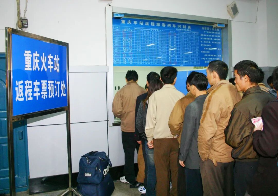 2005年,重庆站返程车票预订处旅客排队场景。重庆火车站供图