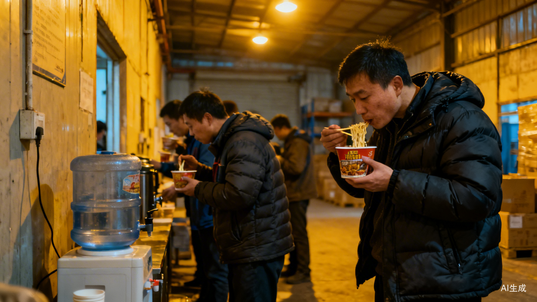 为了节省资金,零跑今年的年会场地选在工厂仓库,没有空调,员工被冻得直跺脚,排队在饮水机旁边打热水吃泡面。