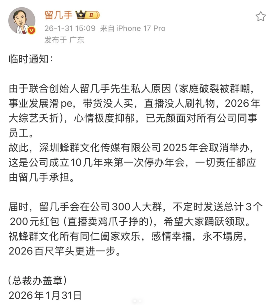 1月31日下午,留几手微博宣布深圳蜂群文化传媒有限公司取消年会。