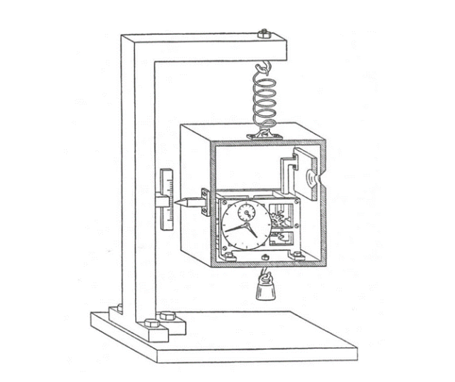 在1930年的第六届索尔维会议上,为质疑不确定性原理,爱因斯坦提出了著名的“光子盒”思想实验。该实验设想了一个不透明的盒子,通过弹簧悬挂在固定的架子上。盒子的一侧设有一个小孔,孔上装有快门,由盒内计时器控制,可在精确指定的时刻开启或关闭。盒子侧面配有指针指示刻度,用于测量出盒子的总质量。
