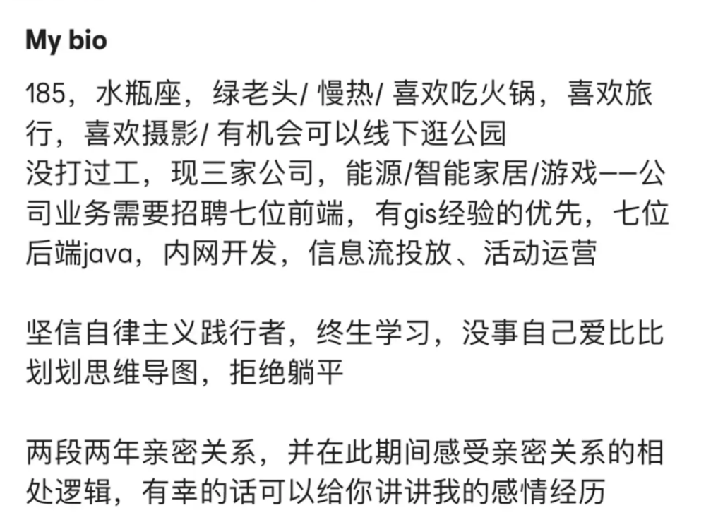 或者,正沉迷在左滑右滑里,欣赏着嘉宾们的曼妙脸孔,滑雪和打高尔夫球的摆拍,精致的下午茶和OOTD,喝抹茶和穿巴恩风的街拍。下一份刷到的嘉宾介绍中明晃晃地写着公司业务需要招聘七位前端,有gis经验的优先,七位后端java,内网开发,信息流投放、活动运营。
