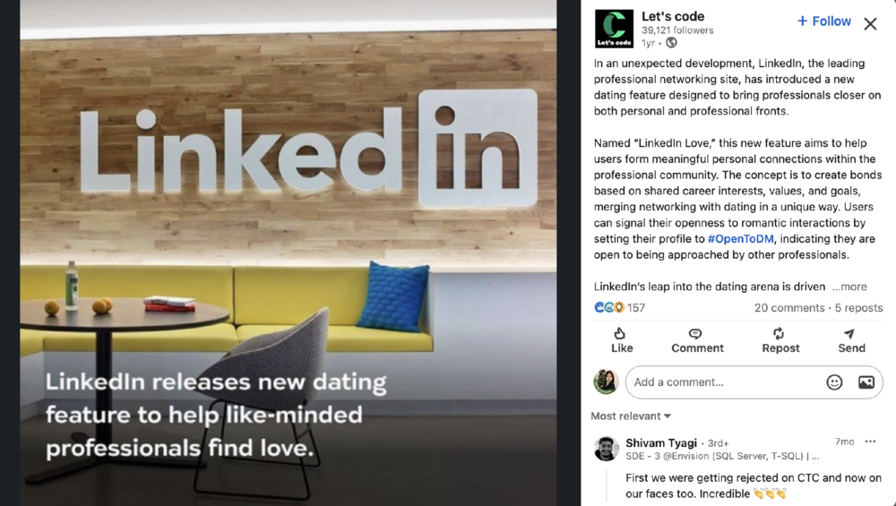 换句话说,这可能是当下Z世代中最流行的相亲方式之一。受欢迎程度之高,以至于Tiktok上也出现了无数情感博主的手把手教程。甚至已经有公司在LinkedIn里开始举办联谊会了。