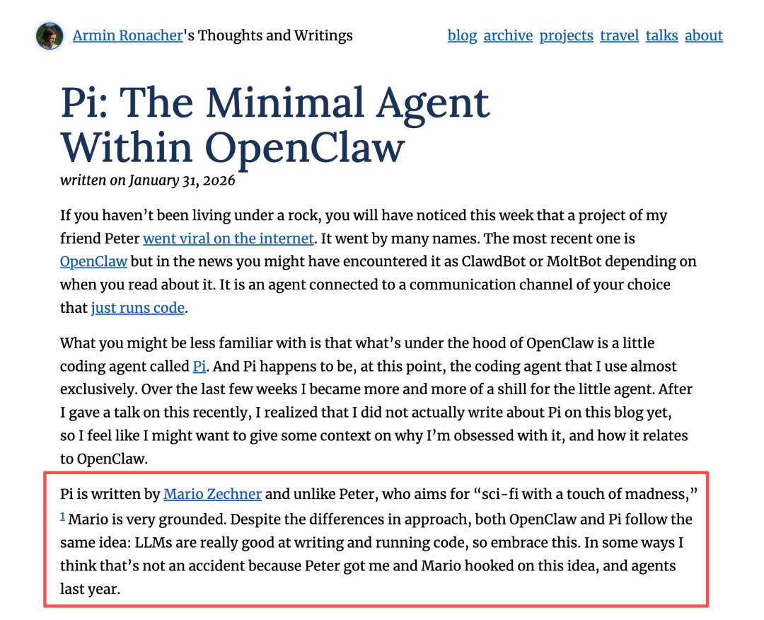- OpenClaw 的 README 中明确致谢:"Special thanks to Mario Zechner for his support and for pi-mono."