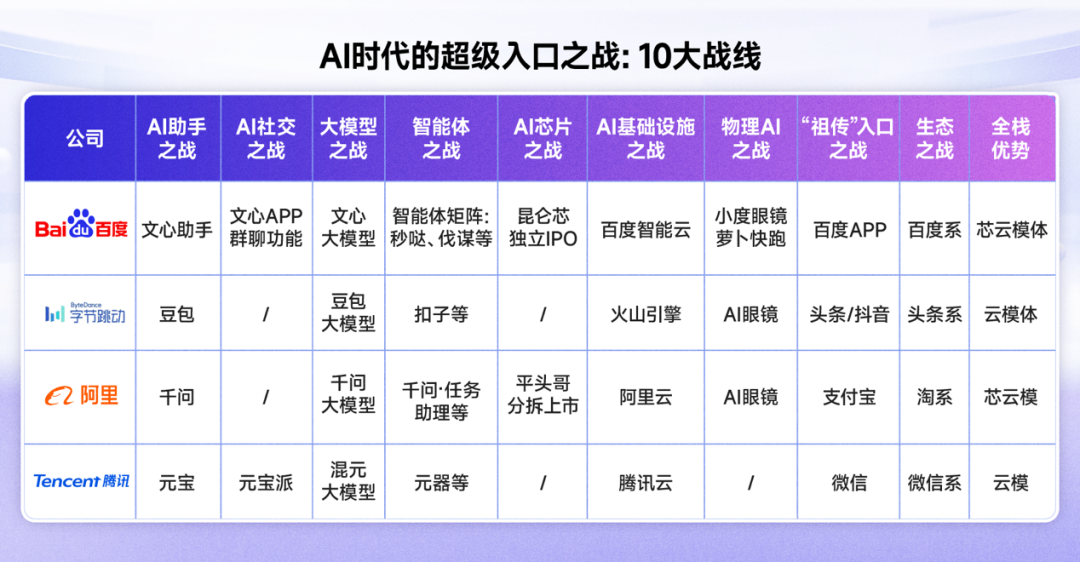 百度也拥有一套强大的生态,在产品生态方面,百度搜索、地图、文库等已成势,在AI大模型时代,百度快速将这些产品接入AI能力,后来这些产品也全面接入MCP。百度文心助手的生态优势也很显著,它不仅接入了百度地图、健康等内部生态服务,还与京东、美团、携程、盈米基金等上百家头部合作伙伴MCP服务,覆盖了用户的大部分需求,如订票、出行、购物、健康等,形成了「搜索即服务」的闭环。当然更强大的还是全栈生态,百度是当前在芯云模体的全栈布局,为其AI应用蓝图提供坚实的支撑。