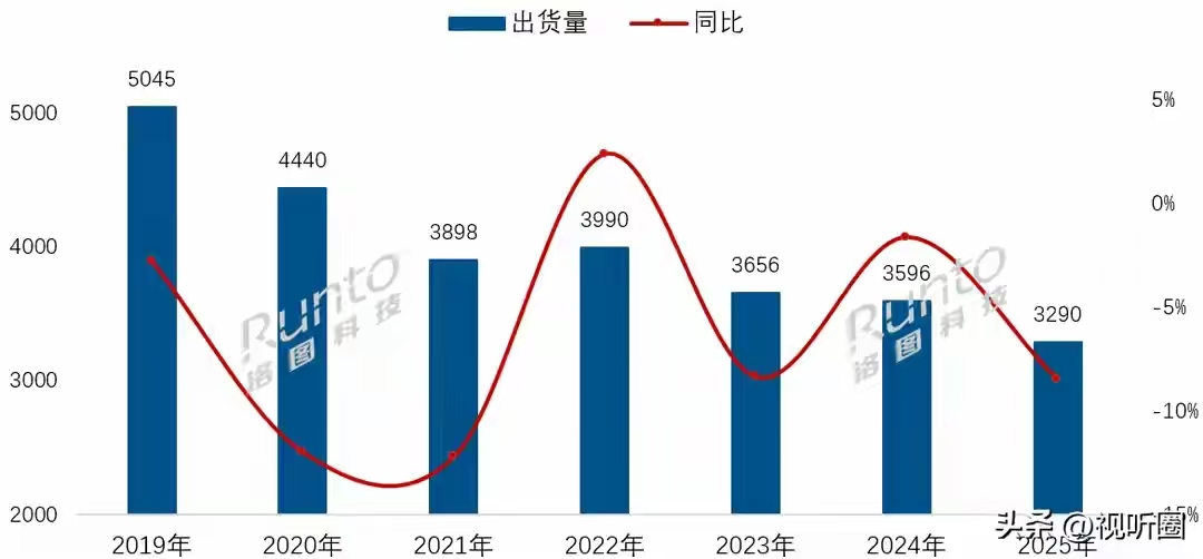 洛图科技数据显示,2025年中国彩电市场整体承压,仅海尔实现不足5%的小幅增长,其余主要品牌出货量均出现下滑。