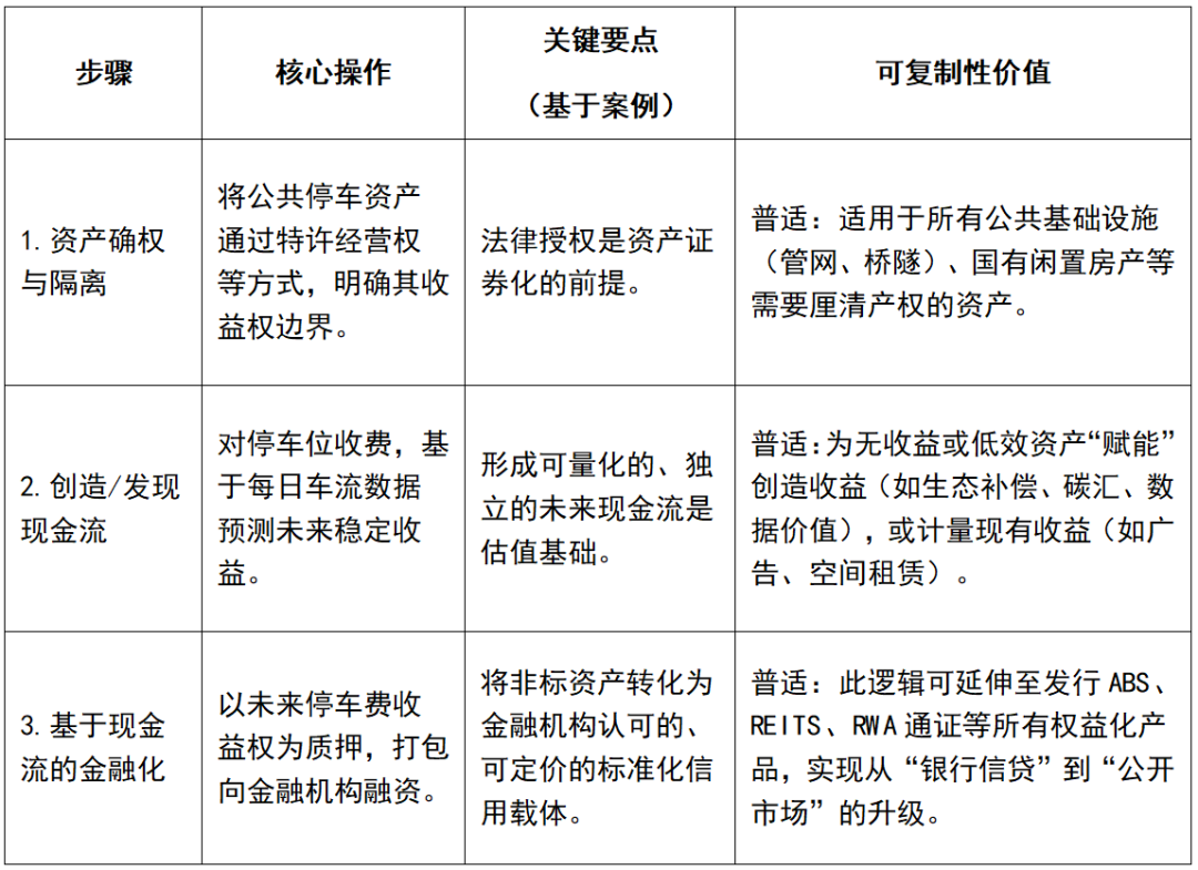 以“南宁慧泊停车场”项目为典型,其从“静态资产”到“可融资权益”的核心三步法,揭示了存量资产盘活的基础、通用逻辑。这构成了模式复制的元规则。